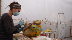 Tout comme le caméléon dans la nature, les couleurs de l’animal sont vivantes et apparaissent différemment en fonction de la longueur des rayons du soleil. Ses écailles, comparables à des centaines de pixels, sont extrêmement colorées. Toute la démarche à la Machine est de trouver une couleur qui vive, que nos couleurs soient mouvantes. Pour ajouter de la nervosité à la couleur, la peintre a travaillé en mélangeant travail au crayon et glacis.